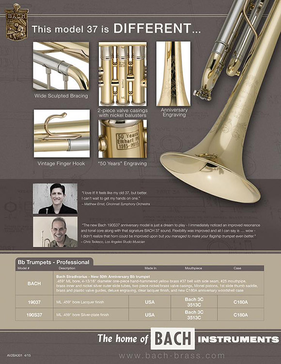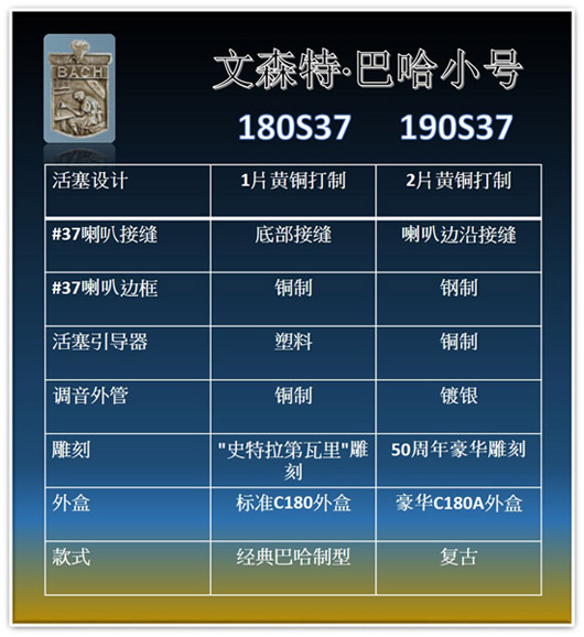 190(S)37是纪念巴哈工厂迁厂50周年而设计的,整支小号都章显了巴哈多年来制造乐器的著名小号手马修‧艾那斯 (Mathew Ernst,辛辛那提交响乐团)、克里斯‧他得斯哥(ChrisTedesco,洛杉机音乐室)、巴哈小号艺术家冯启文都对190(S)37赞不绝口,认为190(S)37不但外观亮丽,音色亦饱满而且富有感染力,反应速度快,吹奏时自然流畅。