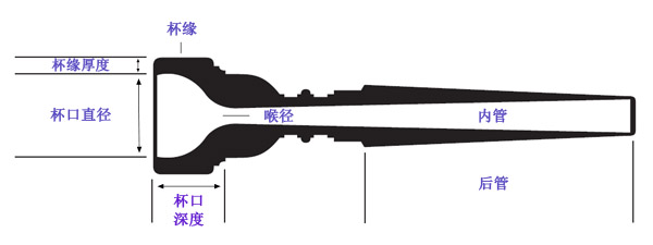 影响吹奏时的舒适度及音准拿捏。较圆的杯缘轮廓在吹奏时会较为舒适;而较尖的杯缘轮廓有助于吹奏出清晰的音色,但如果演奏者嘴唇不够湿润,长时间吹奏杯缘轮廓较尖的号嘴是有可能会感到疼痛的。
