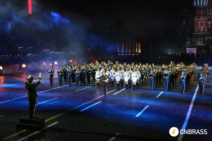 9月5日至13日,在莫斯科举行的“斯帕斯钟楼国际军乐节”上,解放军军乐团演奏员和解放军三军仪仗队女兵冒着大雨坚持演出,图为乐队指挥王登梅指挥演奏《荣耀》。