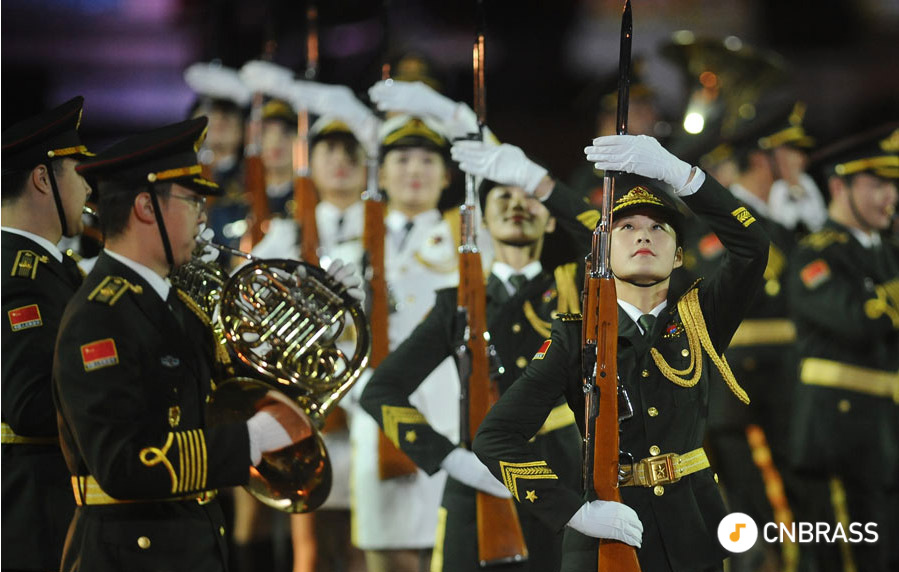 9月5日,在俄罗斯首都莫斯科,中国人民解放军军乐团及三军仪仗队女兵在国际军乐节上表演。