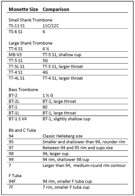 莫奈低音铜管(长号、大号)号嘴型号对照表