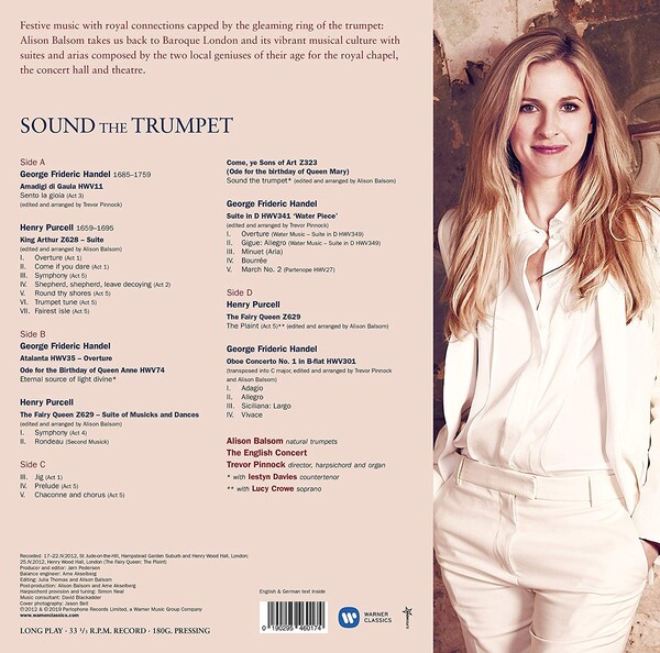 这专辑收录了从韩德尔与菩赛尔的颂歌、小交响曲与歌剧里,为小号创作,或是重新改编成适合小号演奏的乐曲。艾莉森·巴尔松与长於演奏巴洛克时期作品的指挥家平诺克之所以会挑选韩德尔与菩赛尔的作品的原因之一,在於这两名作曲家虽然几乎同一时间居住在伦敦,可是音乐风格完全不同。「乍看之下,韩德尔的作品似乎一眼就能看穿。但是每演奏一次,就会发现每一个音符都有新的意义,每次演出都会出现新的样貌。「菩赛尔则是我的大英雄。他一再打破巴洛克时期的结构与规则,写出让人惊讶不已的和声与节奏。他的作品极具现代性。」艾莉森·巴尔松说。
