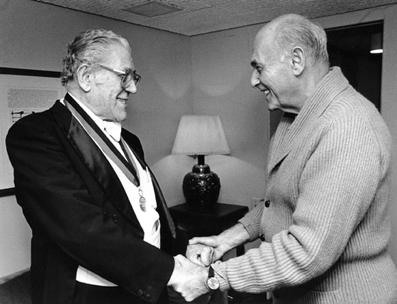 1988年9月29日,乔治·索尔蒂爵士(右)在雅各布斯的告别音乐会后向他表示祝贺
