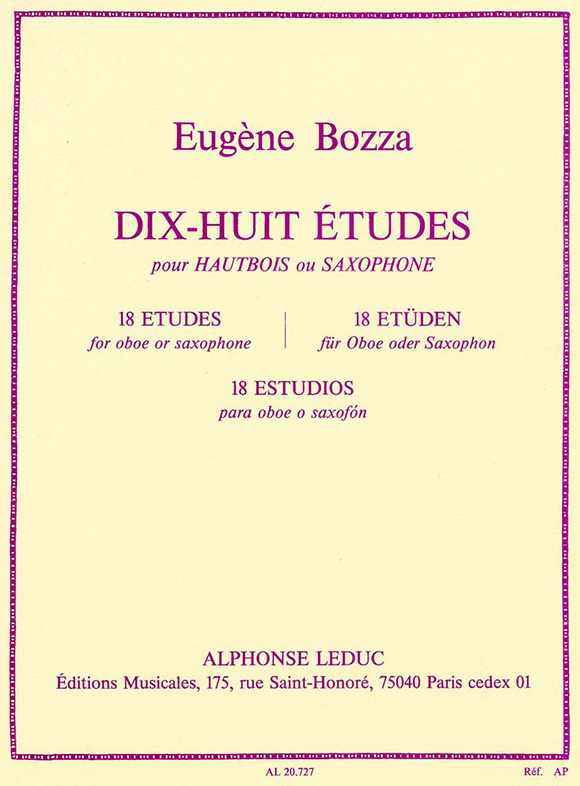 包扎(E.Bozza)《18首双簧管练习曲》尤金·包扎的18首练习曲是双簧管练习曲目中为数不多的由非双簧管演奏者谱写的练习曲,但这并不是说这部练习曲不符合双簧管的特性,整部练习曲的风格非常自由即兴,带有浓郁的印象主义,从中能清楚的感觉到与当时整体音乐风格近似的旋律。对技巧的要求是非常高的,不光是对手指的技巧,更是对演奏者整体把控技能的提升。
