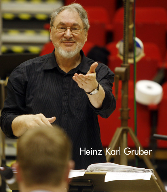 奥地利作曲家海因茨·卡尔·格卢伯(Heinz Karl Gruber),简称HK.格卢伯,在作曲家这个全能行当中,也算是多才多艺。小时候在维也纳童声合唱团呆过四年,后来又去学低音提琴、圆号、电子音乐和舞蹈,是奥地利前辈作曲大师艾内姆的高足。不少现代作曲家有乐队演奏员的经历,因为现代乐队比之传统交响乐团功能更趋复杂精微,切身的演奏经验裨益良多。格卢伯在采尔哈组织的新音乐团体“联盟”(Die Reihe)中任首席低音提琴手。23岁上,他的《乐队协奏曲》获奥地利青年作曲大奖。同时,他也凭借才华,拓展舞台,成了一名戏剧演员和歌手。其后十年中,让他大出风头的是自编自演的讽刺音乐喜剧《弗兰肯斯坦》,他的舞台魅力令该剧在欧美巡演大获成功。八十年代,他靠着多首协奏曲再获瞩目:包括两部《小提琴协奏曲》、《乐队协奏曲》、《打击乐协奏曲》和《大提琴协奏曲》(为马友友而作)。1999年,他为哈登伯格创作的一首具有梦幻色彩的小号协奏曲《空幻》(Aerial)。