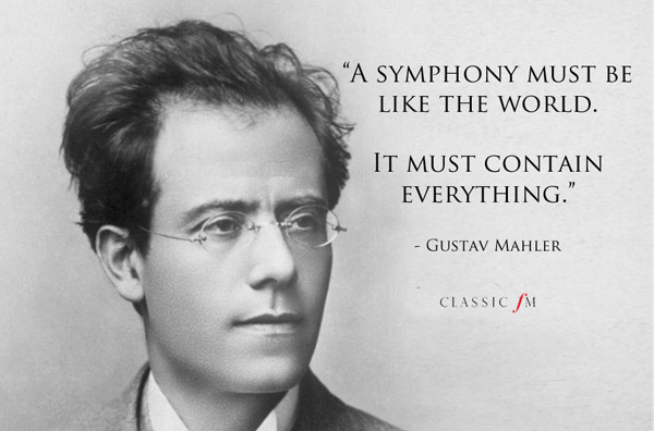 马勒的《第三交响曲》,d小调,作于1895-1896年,原定标题是《一个夏日早晨的梦》,后改为现在的六个乐章结构即:1.引子,夏日的进行曲;2.草原的花朵告诉我什么;3.森林的动物告诉我什么;4.人类告诉我什么;5.天使告诉我什么;6.爱情告诉我什么。在《第三交响曲》中,马勒渴望“将整个世界都被反映出来——可以这样说,作者只不过是一件乐器,整个宇宙都在它身上弹奏”。 这六个乐章从结构上又可以分为两大部分,第一乐章是一个长大的奏鸣曲式,为第一部分,二至六乐章都较为短小,作为第二部分。