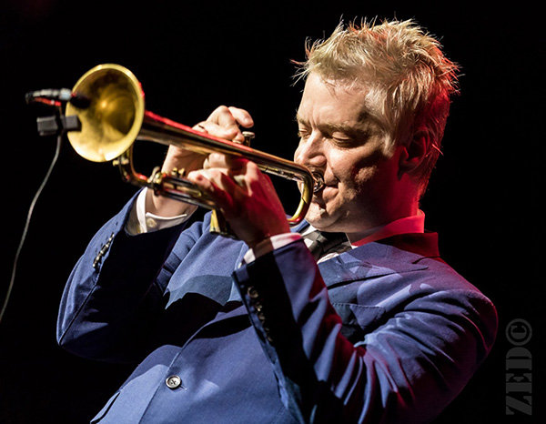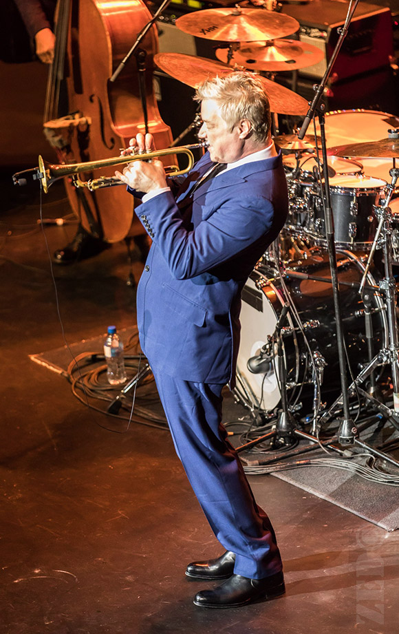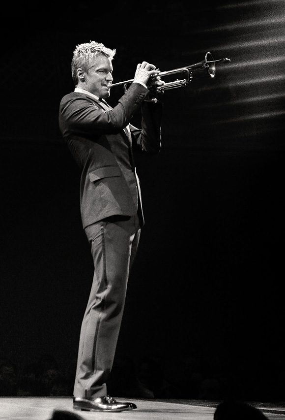 克里斯将红酒杯放在钢琴上,手中那把1940年制造的“Martin Committee”手工古董小号(确认一下,1940年产的为什么称古董?)金光闪闪,著名铜管制造商Vincent Bach Corporation定制的镀银吹嘴紧贴他性感的嘴唇,任其炫耀各种吹奏技巧。他与搭档比利·查尔兹(Billy Childs)现场合奏了若干首曲目,轮廓完美的俊朗脸庞在灯光下散发着难以抵挡的魅力。