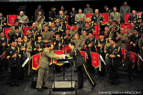 9月27日,中国驻澳大使馆举办庆祝中国人民共和国成立64周年招待会,澳大利亚联邦参议院梅森参议员、澳国防军司令赫尔利上将、澳陆军司令莫里森中将和各国驻澳使节、各界来宾以及两军军乐团1000余人出席,马朝旭大使,梅森参政员、赫尔利上将、岑旭海军中将等先后致词。席间,当中国人民解放军军乐团奏着《中国人民解放军军歌》列队进入会场,全场来宾纷纷放下酒杯,鼓掌欢迎。然后中国军乐队为来宾表演了中国民族乐曲和外国名曲,当会场响起俄罗斯乐曲《野蜂飞舞》时,澳军几位男女演奏员随着乐曲扭动起来。而我军演奏员朱海长时间循环呼吸、肖禹演奏的黑管、小号手王泉泉戴着黑礼帽表演的爵士舞更是让现场的澳大利亚来宾兴奋不已,引来了赫尔利上将一次次情不自禁地与我军演员拥抱致谢!