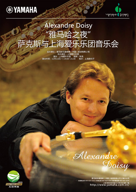 2013年11月11日,在上海音乐厅将举办“雅马哈之夜”萨克斯与上海爱乐乐团音乐会活动,届时会邀请到雅马哈萨克斯艺术家Alexandre Doisy(亚历山大·多伊西)与上海爱乐乐团同台合作演出。此外,在成都(11月13日)和北京(11月15日)将陆续举办音乐会和大师课。雅马哈公司希望借此能提高管乐爱好者的学习积极性,为提高中国萨克斯音乐爱好者的演奏水平作出贡献。