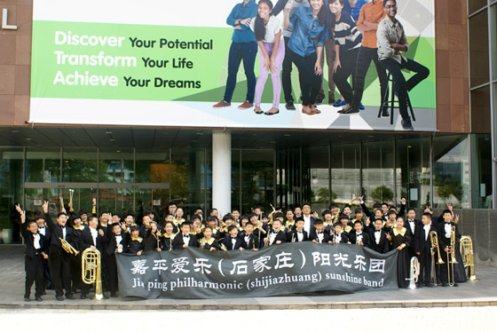 2014年7月21日-27日,嘉平爱乐(石家庄)阳光乐团69名学生赴新加坡参加了“2014新加坡国际管乐节”。这69名学生中,有75%为小学生,最小的只有9岁。他们都来自石家庄市各中小学,由北京嘉平爱乐管乐教育中心培训的各校优秀管乐团员。7月23日,在新加坡共和理工学院举行的2014年新加坡国际管乐节上,嘉平爱乐阳光乐团荣获中学组铜奖,这已经是阳光乐团第三次在国际管乐节中获奖了。