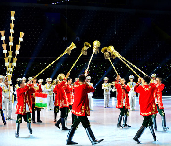 来自塔吉克斯坦的国防部警备团军乐团常年承担着国家元首会晤仪式、总统就职典礼等国家和军队重要司礼演奏任务。该团能够演奏众多国家的国歌、进行曲以及其他经典作品,拥有一批才华横溢的乐队成员,能够用卡尔奈号和多伊拉鼓等特有民族传统乐器演奏动听的旋律。开幕式上,他们演奏了《军号嘹亮》、《奋勇向前进行曲》、《季洛瓦尔进行曲》等极富民族特色的作品。