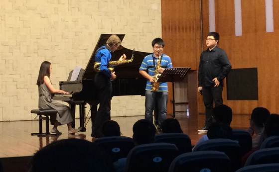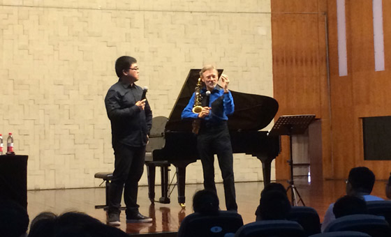 此次专业学术交流活动的最后一项内容,由克劳德夫妇联袂为现场听众表演了两首风格迥异的新作品。其一,是旅法中国作曲家田蕾蕾新近创作的萨克斯管与钢琴《创新人类》(let us create man),该曲构思新颖,创作理念与技法前沿,此次系中国首演,听后令人耳目一新、印象深刻。其二,是根据俄罗斯作曲家普罗科菲也夫的一首长笛奏鸣曲改编的萨克斯管作品,经改编后的作品充分展现了萨克斯管别具一格的表现技巧和艺术魅力,加之克劳德夫妇娴熟的技艺和高深的造诣,使他们的诠释和表演可谓珠联璧合、熠熠生辉,现场听众无不为之叹服不已。