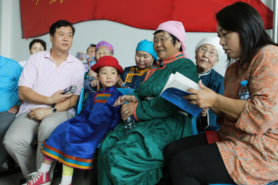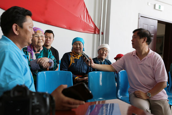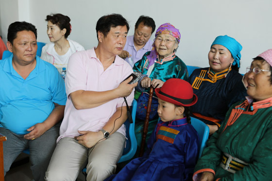 专门从牧区请来了多位当地老艺人,和创作小组进行亲切的交流,牧民们身穿礼服,演唱了很多传统的蒙古族原生态歌曲,如:催奶歌,嫁女歌等优美的民间小调,乌兰牧骑的年青演员也在现场展示了蒙古长调、呼麦、马头琴及民族歌曲,纯正的民间艺术和民族唱法深深的打动了在场的每一个人。王和声老师激动地表示:老牧民和全国第一支乌兰牧骑的歌声棒极了。震撼!感动!