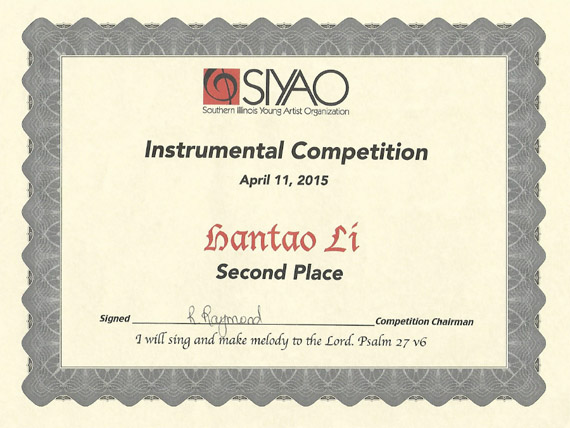 “美国南伊利诺斯青年艺术家比赛”始于2003年,为美国青年艺术家重要赛事之一,比赛由SIYAO(Southern Illinois Young Artist Organization )组办,每年一届,比赛选手为20-30岁的青年艺术家。比赛分声乐组和器乐组,每组只设一、二、三名奖,并视比赛情况可以空缺。