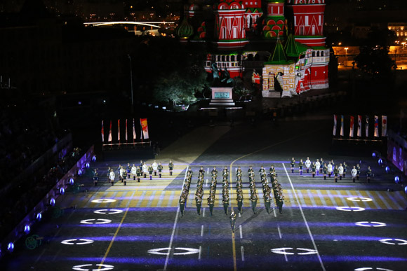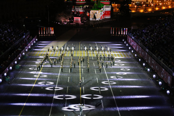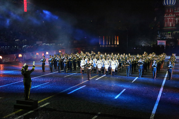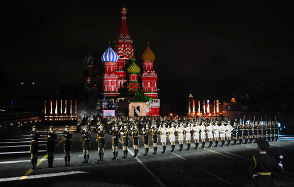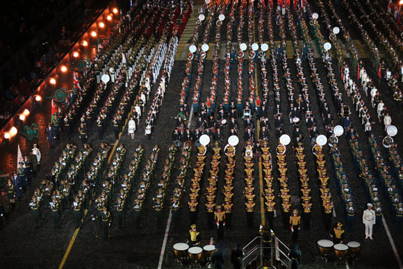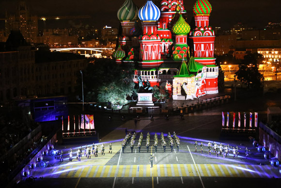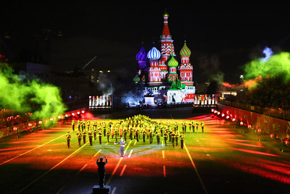 俄罗斯“斯帕斯钟楼”国际军乐节每年9月在莫斯科红场举行,演出采用大型军乐国际汇演形式,期间除了庆祝“莫斯科城市日”外,俄罗斯军乐团还可以与各国军事文化和民间艺术进行交流。此次军乐节为第8届,自9月5日开始至13日结束。期间有来自俄罗斯、中国、比利时、英国、希腊、爱尔兰、哈萨克斯坦、墨西哥、巴基斯坦、斯洛文尼亚、日本、白俄罗斯和意大利13个国家的军乐团、仪仗队和民间艺术团共1500人参加演出。
