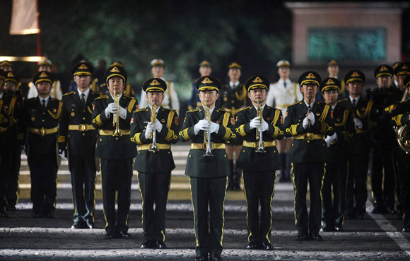 各国军乐团联合演奏《胜利日进行曲》,纪念反法西斯战争胜利70周年。