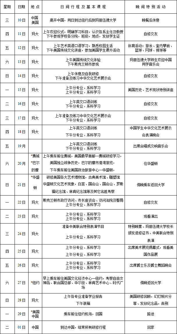 通过美国高校艺术研修班的实施,搭建中美艺术教育的国际交流平台,开拓中国艺术大学生的艺术视野,通过与艺术名校教授与同学的交流和学习,更深层次地了解国际艺术,特别是美国艺术教育和发展的现状,得到西方文化艺术的第一手自我感受,从而为更高层次的国际艺术学位学习获得直接的感性认识。参加美国高校艺术研修班不失为一次美国艺术文化的探索和体验之旅,由于此次活动将有来自中国多个高等艺术院校的师生参加,同时也是一次与中国艺术同学的一次交流盛会。更是一次难得的以艺会友的国际聚会。
