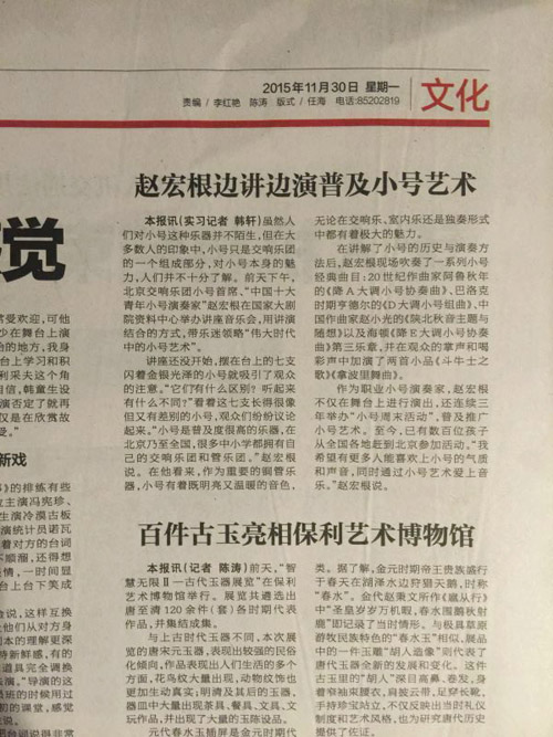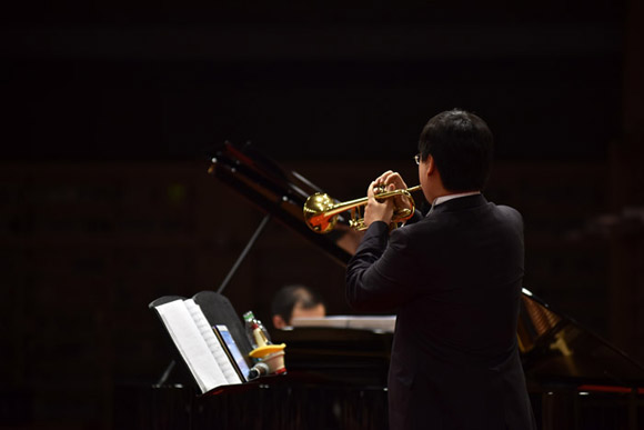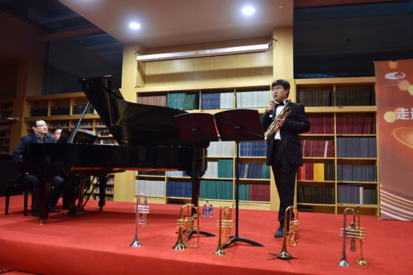 “小号是普及度很高的乐器,在北京,在全国,很多中小学都拥有自己的交响乐团和管乐团,为小号演奏家的培养奠定了很广泛的基础。作为铜管的重要乐器,小号有着既可以明亮又可以温暖的音色,无论在交响乐、室内乐还是独奏形式中都有着极大的魅力。”赵宏根向观众讲解。“作为职业小号演奏家,我不仅要活跃在舞台上为观众带去好的音乐,更希望在普及小号艺术教育的工作中多出一些自己的力量。”