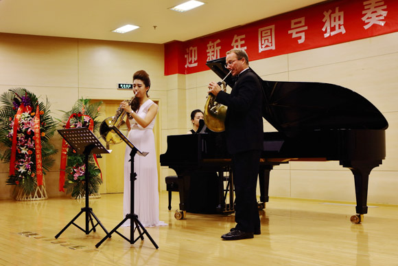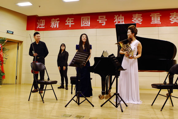 北京的冬天,虽然寒冷,但没能挡住人们前往中央音乐学院聆听圆号音乐会的脚步。2015年12月19日晚19点30分,在中央音乐学院教学楼701音乐厅里传来阵阵优美动听的圆号声,虽然北京雾霾笼罩多日,但是全场座无虚席,掌声热烈。以美国圆号大师艾瑞克.罗斯科(Eric Ruske)教授领衔出演的《迎新年圆号独奏重奏音乐会》正在按时举行。参加这次音乐会的阵容强大,他们是:旅美青年圆号演奏家张咪咪博士,中央音乐学院圆号教授张诚心老师,青年小提琴家陈曦老师,青年钢琴家马晓鸥老师,青年钢琴家沈玥老师。聆听他们的演奏,让我们零距离的欣赏到了大师们的高超表演,深深的陶醉在优美的圆号声中。通过这次圆号音乐会,使中国的圆号同行们收益匪浅,感慨万千。