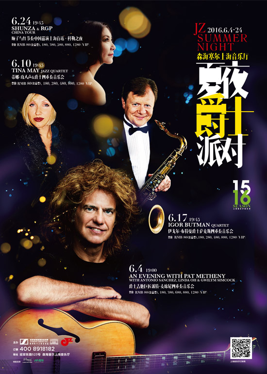 JZ Music与森海塞尔上海音乐厅联袂推出2016“夏夜爵士派对 JZ Summer Night”系列,汇集当今世界顶尖爵士音乐家Pat Metheny、Tina May、Igor Butman、顺子与红节奏,在这个热情洋溢的六月,让您感受爵士乐的灵魂与内核!