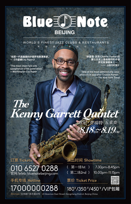 Kenny Garrett五次格莱美奖提名、八次Downbeat杂志票选年度最佳中音萨克斯手、拿过格莱美和Downbeat年度最佳爵士乐专辑、Miles Davis巡演乐队成员、对中国感情深厚曾创作《长城之外》(Beyond the Wall)并以此获得当年格莱美年度最佳爵士器乐专辑提名的 Kenny Garrett 将作为我们的开幕嘉宾拉开北京Blue Note爵士舞台的序幕!