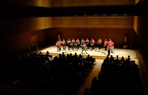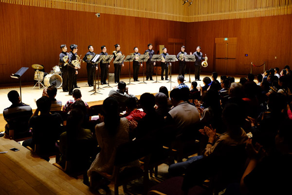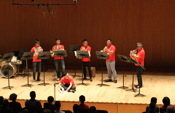 音乐会的下半场曲目以风俗性作品为主,既有爵士韵律,又有探戈节奏,表现出圆号这个乐器不拘一格、变化多端的性格,可以古典,也能够通俗。重奏团的演奏家们不仅在风格把握、技术性能上表现出圆号的“跨界”性,更是在形式上加入了众多元素,有肢体、有演唱,还加入了爵士鼓和电吉他,表演上幽默风趣,轻松愉悦,看得出,如此多元性和包容性的曲目安排,是演奏家们精心策划的一场丰富多彩、富有创意的专场音乐会。最后的返场曲目,来自柏林爱乐的圆号演奏家,突然出现在观众席中,吹响了“茉莉花”的旋律,令观众异常“惊喜”,将整台音乐会推向了高潮。