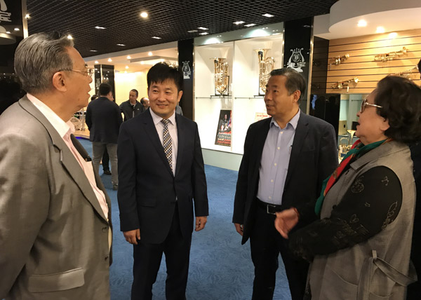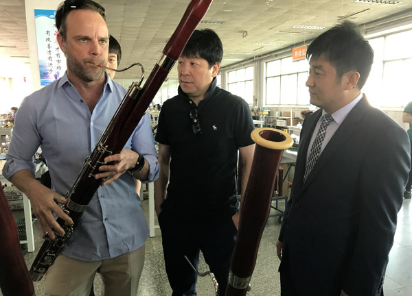 特别是看到津宝公司高度机械化自动化的巴松生产线时,大家再一次被眼前呈现的一切震惊了,以至于来到巴松成品展示区时,演奏家们都按耐不住激动的心情,纷纷拿起乐器反复试奏、揣摩、现场研讨,就连大师马丁·库斯克曼也不例外,试奏了多款产品,频频点头称赞,音乐家们纷纷拿出手机、相机与展品合影,与刘运斌总经理合影,更有几位老师现场就订购了好几个产品,爱不释手!久久不肯离开。