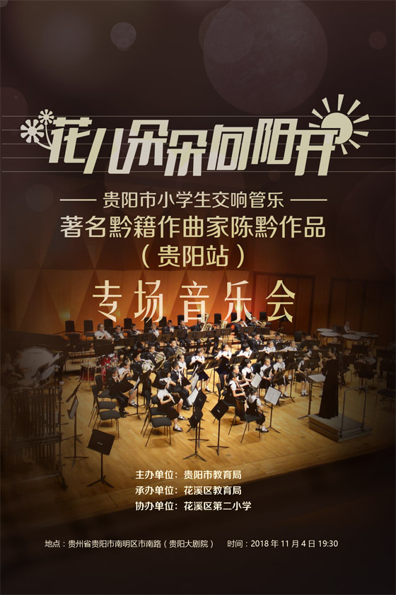“花儿朵朵向阳开”贵阳市小学交响管乐(著名黔籍作曲家陈黔作品——贵阳站)专场音乐会将于11月4日在贵阳大剧院举办,这也是国内的小学生管乐团首次举办陈黔作品专场演出,值得关注与期待。