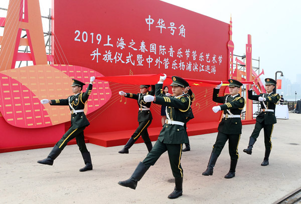 5月1日上午,中华号角—2019上海之春国际音乐节管乐艺术节升旗仪式暨中外管乐杨浦滨江巡游活动在杨浦滨江举行。有别于往年,今年为了让市民游客能够真正零距离欣赏到行进管乐的魅力,杨浦区首次将“浦江巡游”改为了“滨江巡游”,由12支中外优秀管乐团队轮番献演。