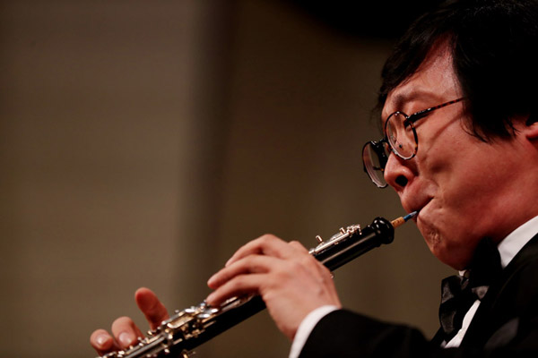 最后的压轴曲目是由金京春教授“根据12部交响乐中的双簧管声部主题改编的重奏”中柴可夫斯基第四交响曲第四乐章选段。此曲由祝老师的学生们,中国爱乐乐团首席袁小钢、中国音乐学院汤璐副教授、前香港交响乐团双簧管首席黄铮、中国人民大学艺术学院管乐教研室主任王深及中央音乐学院、中国音乐学院双簧管专业学生们等五十余人共同演奏。恢弘的气势把音乐会推向了高潮 !
