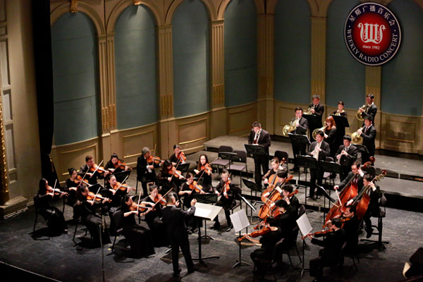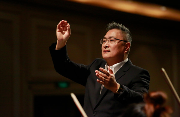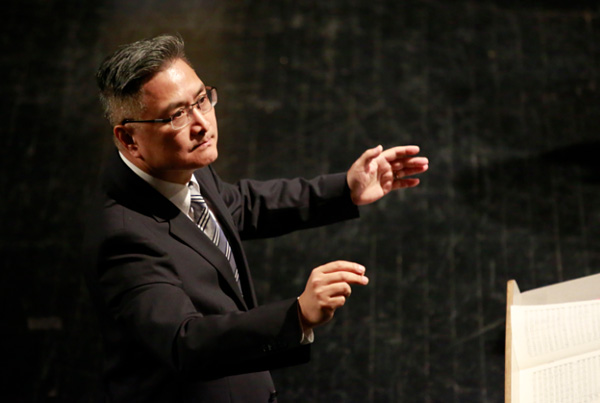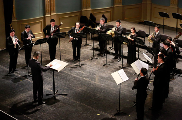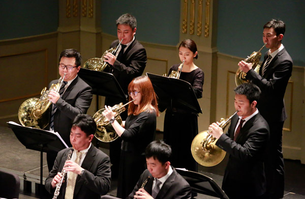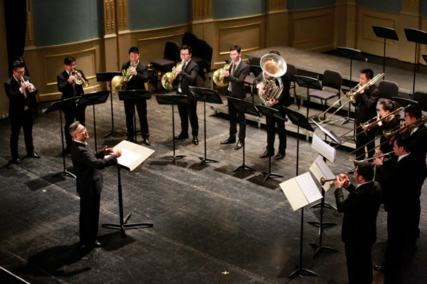 近年来,在作为一名圆号演奏家的同时,韩小明还将部分的工作重心转向了中国音乐事业,组织策划了多场全国性的音乐节及音乐会,此次他更是担起了指挥一职。在他的带领下,乐团接着演绎了两首铜管作品:加布里埃里《强弱奏鸣曲》和苏萨托《铜管舞曲》。