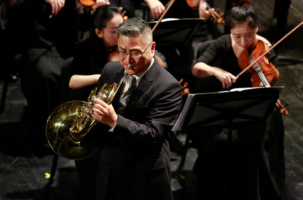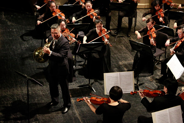 只见韩小明跨前一步,双手端起手中的圆号往唇上轻轻一靠,悠长饱满的号声响起,萦绕在耳畔。在这相对精巧的小编制乐团中,圆号的音量得到了很好的体现,那种沉稳而圆润的音色便可充分的发挥。在他的演奏中,坚实有力的音韵,圆润流畅的连音和快速灵巧的吐音都一一得以展现。