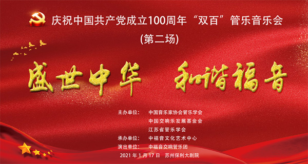 为庆祝中国共产党成立100周年,由中国音乐家协会管乐学会、中国交响乐发展基金会、江苏省管乐学会主办,中福音文化艺术中心承办的“庆祝中国共产党100周年“双百”管乐音乐会”第二场---“盛世中华•和谐福音”管乐专场音乐会于2021年1月17日在苏州保利大剧院成功举办。