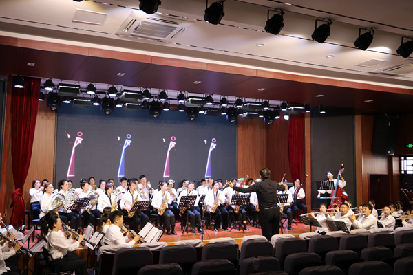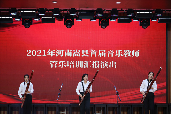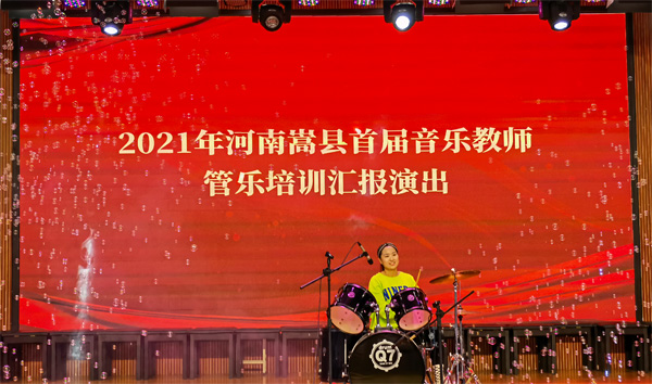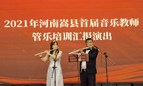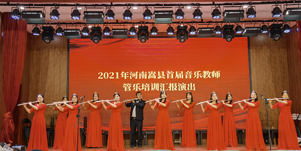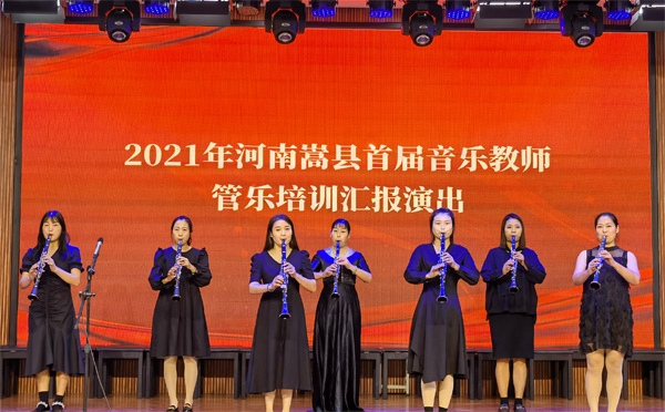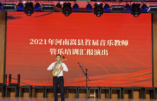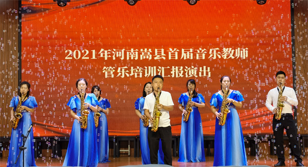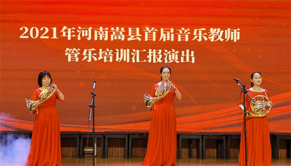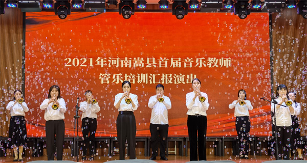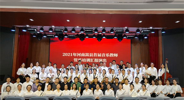 2021年9月30日下午,在国庆佳节即将来临之际献礼建党100周年,嵩县首届音乐教师管乐培训汇报演出在嵩县教师进修学校隆重举行,参与演出的是嵩县“爱之声”交响管乐团。此次专场汇报音乐会共演绎了《我心永恒》、《莫斯科郊外的晚上》、《欢乐颂》、《康美之恋》、《太阳出来喜洋洋》、《康康舞曲》等近20首耳熟能详的经典曲目,演出形式包含独奏、单声部齐奏及管乐合奏。跳动的音符、悦耳的旋律赢得了在场观众的阵阵掌声,为大家呈现了一场完美的视听盛宴。
