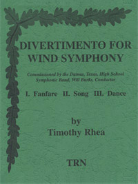 The Divertimento for Wind Symphony was composed during the spring of 1996 and was completed in the month of May. Each of its three movements attempts to capture a different spirit and musical flavor and to explore the various colors available in the modern wind band. I. Fanfare - designed to capture the listeners attention with its heavy use of brass and percussion. The movement is based on the intervals of fourths and fifths first stated in the trumpets and answered in the lower brass. It is suggested that the final gong note almost fade away before starting the second movement. II. Song - takes a simple melody and explores various instrumental colors and harmonic treatments before a final statement by the full ensemble. The movement begins and ends quiet and mysterious giving the listener much opportunity to paint their own musical picture and thoughts. Again, it is suggested to let the wind chimes and final chime note fade away before starting the final movement. III. Dance - a lively movement in rondo form designed to show off the technical ability of the band. This movement takes two themes as well as a separate motivic ability and attempts to weave them together throughout the movement before ending with an exciting coda finish.