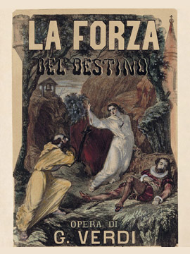 《命运之力》,四幕歌剧,皮亚韦编剧,威尔第谱曲。是1861年6月,威尔第受俄国彼得堡王室剧场的嘱托,为他们写一部歌剧。《命运之力》是威尔第附有完美、充实序曲的歌剧之一,而且是其中最通俗的名曲,经常单独在音乐会上演奏。这首序曲几乎跳脱了从前的曲式,自由地驱使剧中的主题,暗示出整部戏剧的内容。