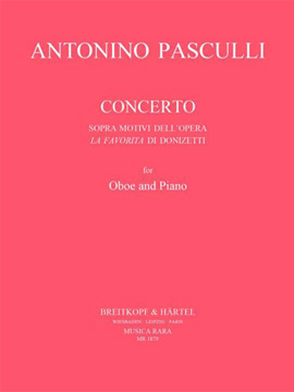 安东尼奥·帕斯库利(Antonio Pasculli, 1824-1924)是十九世纪后期意大利著名的双簧管作曲家,帕斯库利深谙双簧管的演奏极限,其双簧管作品充满花腔般的旋律,与高难度的炫技段落,挑战双簧管演奏者的技巧极限。《宠姬》一曲为帕斯库利乐曲中常被演奏的曲目,其谱曲素材源自董尼才悌(Gaetano Donizetti, 1797-1848)的歌剧《宠姬》。此曲对双簧管演奏者来说,技巧具挑战性,主题旋律优美,而音乐也融合了歌剧故事之戏剧性。Publisher: Musica Rara (Germany), Edition: 1879